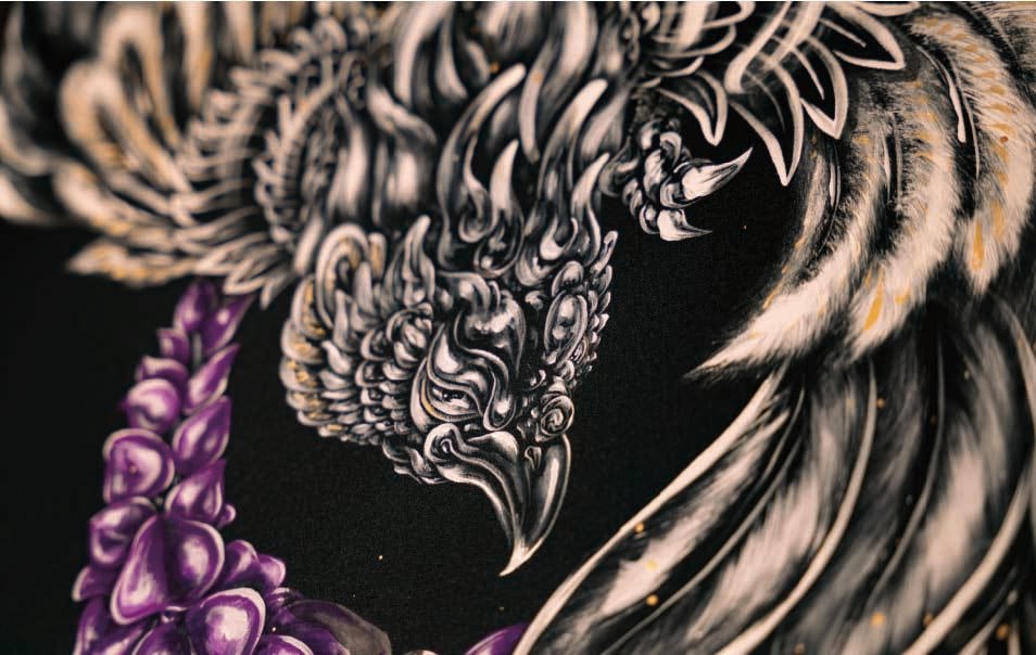 不死鳳凰 黑幕ポスター額なし size:A3:297×420(ポスター) 竹素材の紙質を使用しております。 シリアルナンバー付き 81枚限定となります。 こちらは黒幕の象徴であり、藤の花と鳳凰を掛け合わせた作品になります。 藤の花は樹齢が長く長寿を象徴するため『不死』『延命長寿』『家運繫栄』 の縁起物になっております。 他にも芳しい香りが『魔除け』や『幸運』を引き寄せるといわれており、 風に揺れる姿から『歓迎』を表し、つるが絡み合うように伸びる姿から 『忠実』な関係を表す花言葉もあります。 平安時代では『貴族の花』として高貴な象徴ともされております。 鳳凰は『平和』や『幸福』の象徴とされております。 麒麟・霊亀・応龍と共に「四霊」とよばれる神秘的な瑞獣とされ あらゆる鳥類の長であり、徳の高い人物に現れるとされております。 鳳を雄、凰を雌となり、鳳と凰が一体となった姿で描かれることから 『愛』や『夫婦円満』の象徴にもなります。 ・モニター発色の具合により色合いが異なる場合がございます。